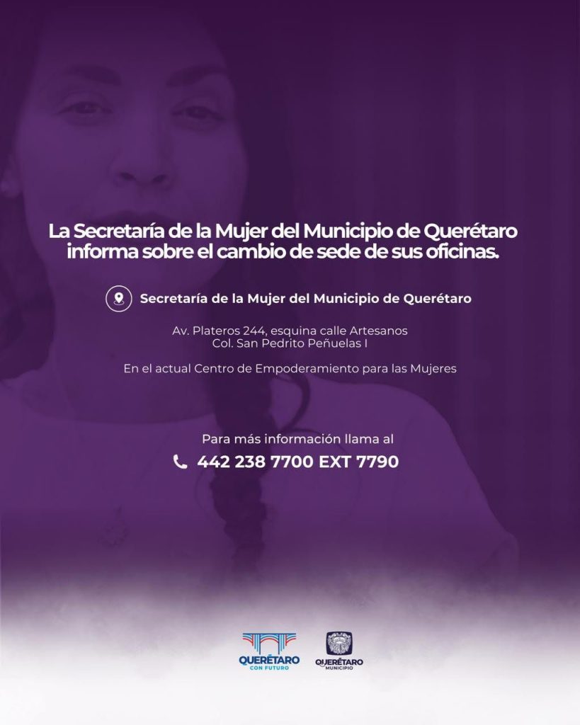 Las nuevas oficinas de la Secretaría de la Mujer se localizan en Avenida Plateros número 244, esquina con calle Artesanos, en la colonia San Pedrito Peñuelas I. Para recibir información o solicitar atención, las interesadas pueden comunicarse al teléfono 442 238 7700, extensión 7790, donde personal capacitado brinda atención especializada.