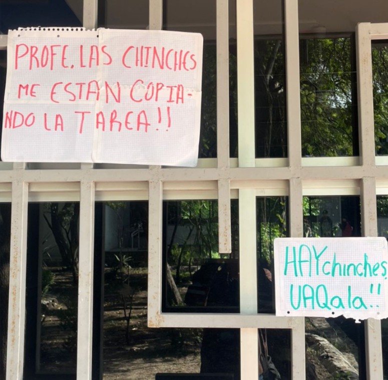 Varios alumnos expresaron su molestia mediante pancartas colocadas en salones y espacios comunes, denunciando que habían detectado insectos y solicitando atención inmediata.