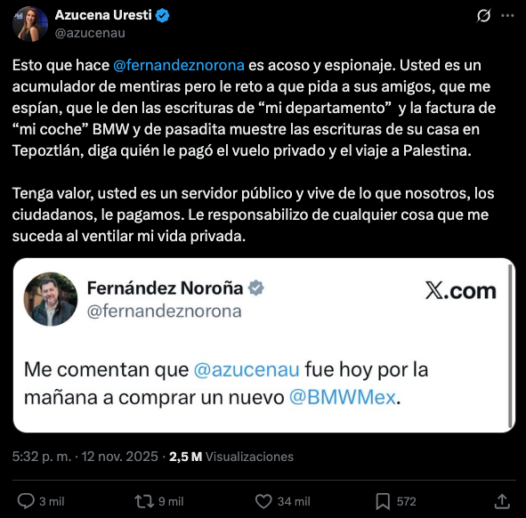 La periodista Azucena Uresti lanzó una fuerte acusación contra el senador Gerardo Fernández Noroña, señalándolo por acoso, espionaje e intimidación en redes sociales, luego de que el legislador difundiera información personal sobre la compra de un automóvil BMW, presuntamente a su nombre.
