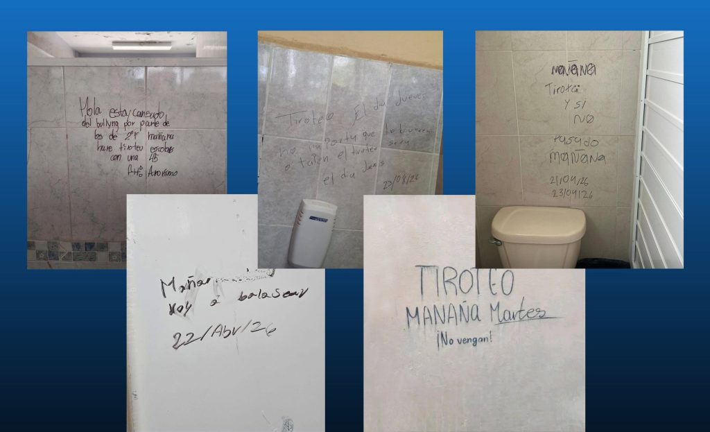 Las autoridades señalaron que este tipo de publicaciones podrían estar vinculadas a una tendencia en redes sociales, donde algunos estudiantes escriben mensajes alusivos a posibles ataques en espacios como baños o mobiliario escolar, lo que ha sido catalogado como una práctica irresponsable.