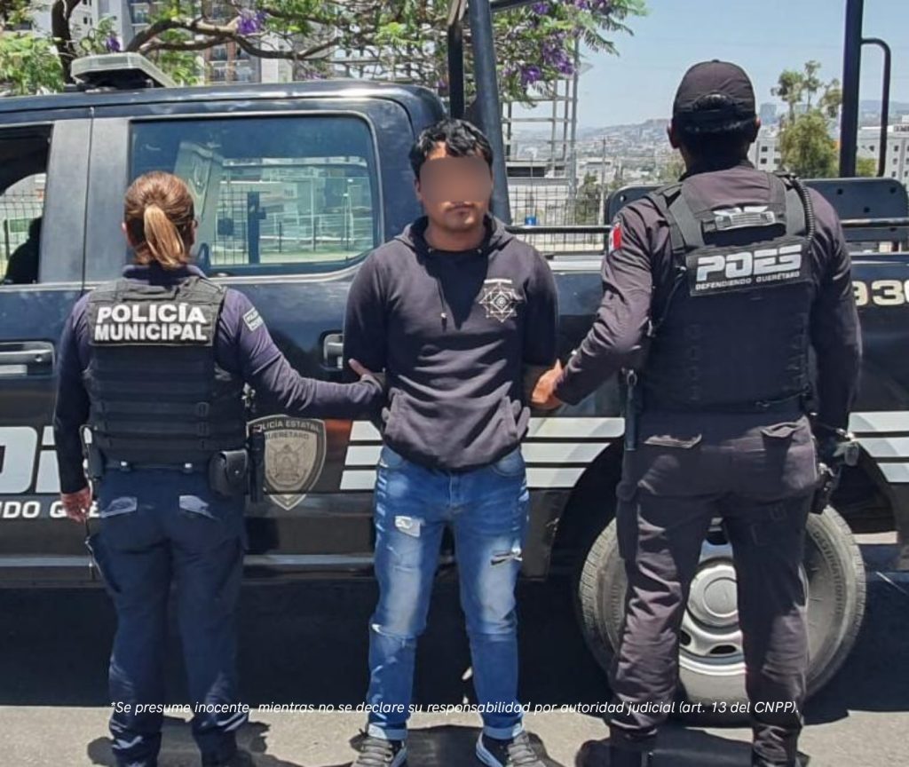 Querétaro, Qro., Como parte del Operativo A.R.M.A. implementado en el Centro Histórico, elementos de la Policía Estatal y Municipal de Querétaro detuvieron a un hombre en posesión de sustancias con características de droga.