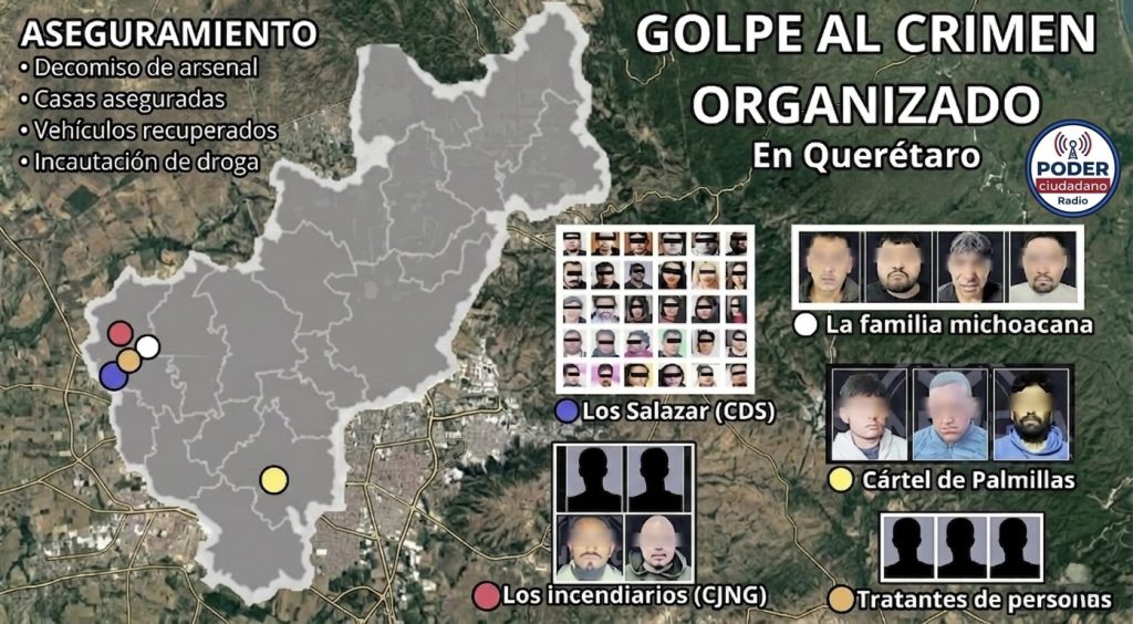 En acciones más recientes, autoridades realizaron cateos en San Juan del Río que permitieron la detención de tres presuntos integrantes del llamado “Cártel de Palmillas”, incluido un supuesto jefe de plaza. Asimismo, en un operativo federal se desmanteló una red de trata de personas que operaba en Querétaro, Hidalgo y el Estado de México, con un saldo de tres detenidos y cinco víctimas rescatadas.