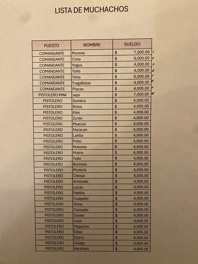 La documentación incluye supuestos pagos a halcones (vigilantes), sicarios y comandantes, con sueldos semanales que iban de 2 mil 500 a 6 mil pesos. También se contemplaban gastos operativos como gasolina, renta de “bases”, despensas y reparaciones mecánicas.