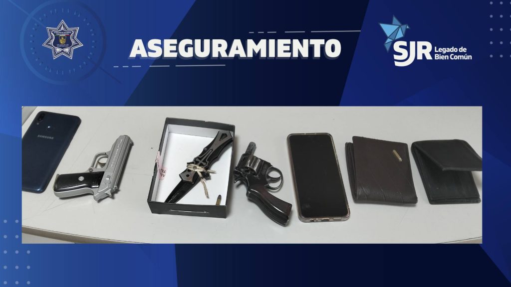 Tras recibir las características de los presuntos responsables, se implementó un dispositivo de búsqueda en la zona, logrando su localización minutos después. Durante la inspección preventiva, los oficiales aseguraron una navaja metálica color negro, dos teléfonos móviles, un arma de fuego, una réplica de arma de fuego, un cartucho útil y dos carteras.