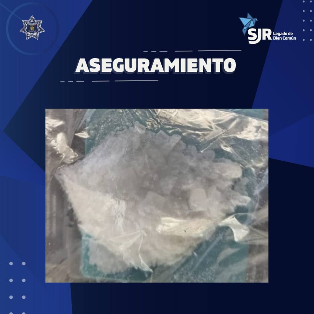 De acuerdo con el reporte oficial, la femenina intentó ocultarse al notar la presencia policial, lo que derivó en una inspección preventiva por parte de los elementos. Durante la revisión, le fue localizada una bolsa plástica que contenía una sustancia granulada cristalina con características similares a la metanfetamina.