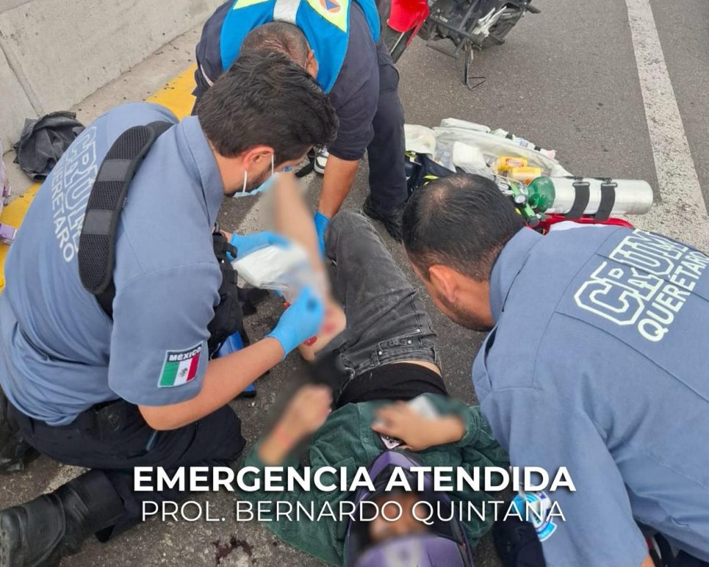 De acuerdo con los primeros reportes en el lugar, la motocicleta circulaba por Prol. Bernardo Quintana cuando se produjo el impacto contra un automóvil. Testigos solicitaron apoyo al 9-1-1 y arribaron paramédicos y elementos de seguridad vial para asegurar la zona, atender a las víctimas y desalojar carriles.