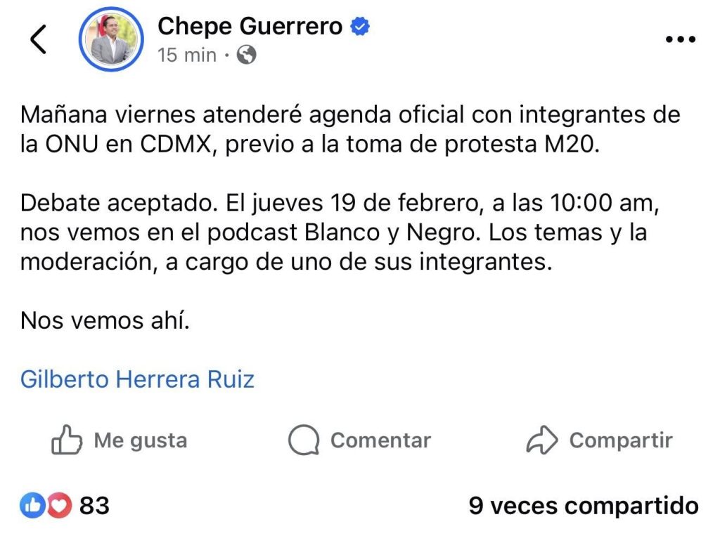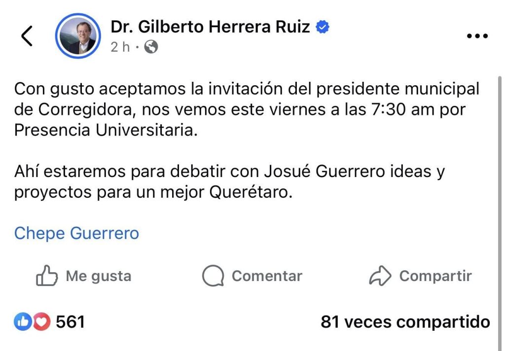 A través de sus redes sociales, Herrera Ruiz informó que aceptó la invitación y anunció que el encuentro se realizará este viernes a las 7:30 de la mañana en Presencia Universitaria, donde —dijo— debatirá “ideas y proyectos para un mejor Querétaro”.