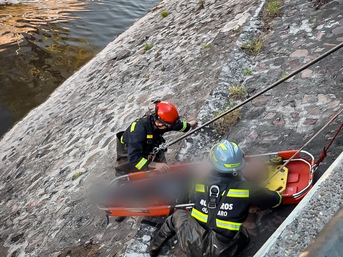 Bomberos Querétaro lograron poner a salvo a un masculino localizado al interior del cauce; fue trasladado para atención médica especializada.