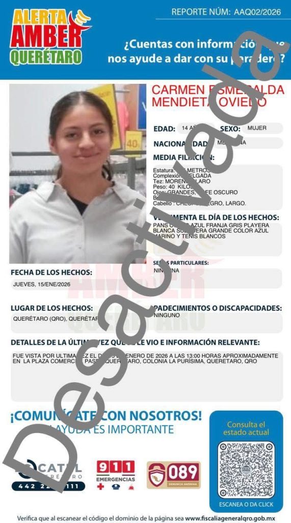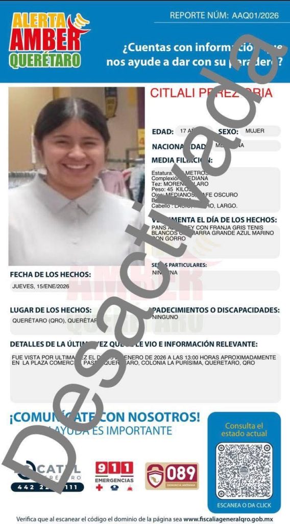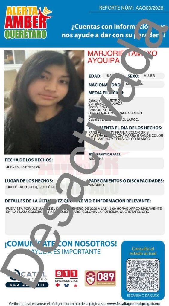 Aunque las fichas de búsqueda dejaron de difundirse públicamente, la desaparición de tres adolescentes en Querétaro sigue sin resolverse. La Fiscalía General del Estado informó la desactivación de las Alertas AMBER emitidas para Citlali Pérez Oria, Carmen Esmeralda Mendieta Oviedo y Marjorie Tamayo Ayquipa, aclarando que la búsqueda continúa activa mediante otros mecanismos de investigación.
