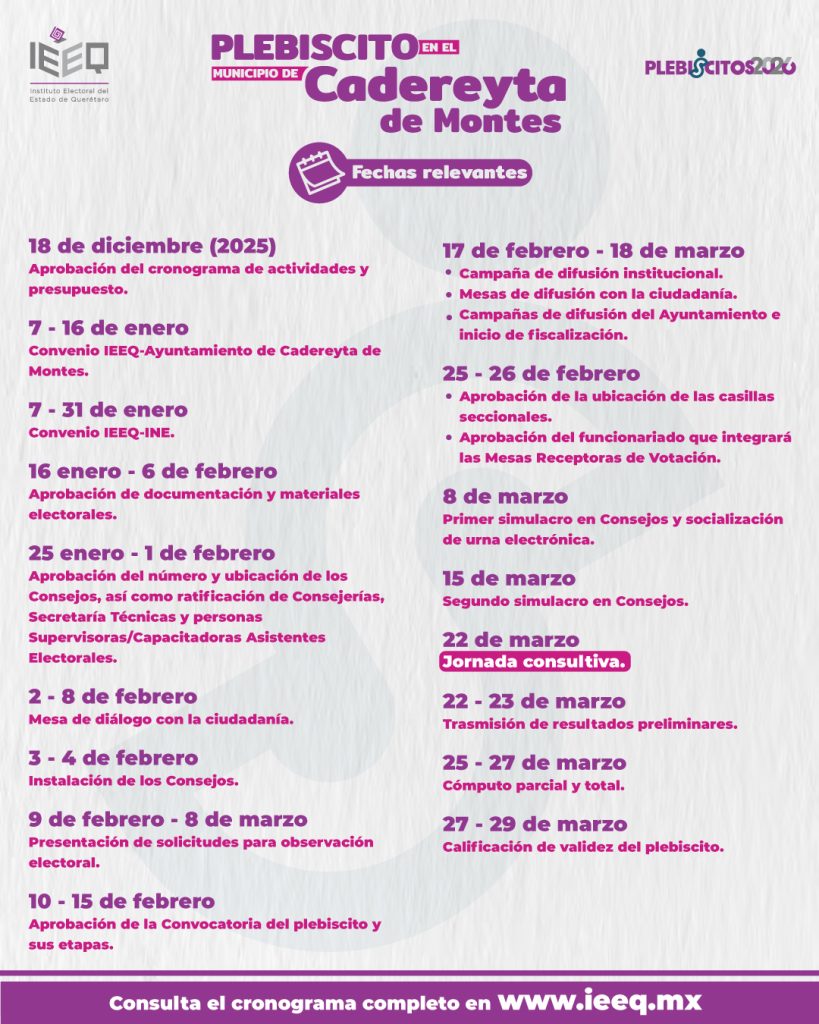 El Instituto Electoral del Estado de Querétaro (IEEQ) aprobó el cronograma de actividades y el presupuesto para los plebiscitos que se realizarán en 2026 en los municipios de Querétaro y Cadereyta de Montes, ejercicios mediante los cuales la ciudadanía decidirá sobre proyectos estratégicos en cada demarcación.