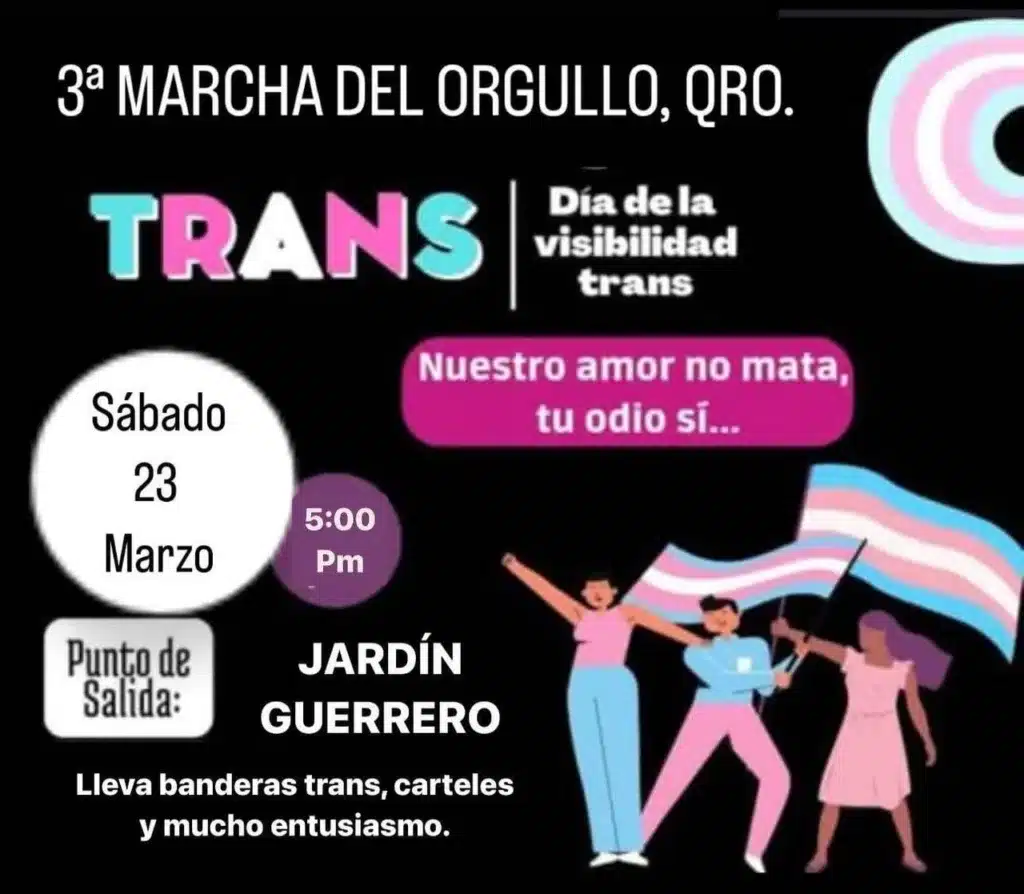 Colectivos y organizadores han anunciado la tercera marcha transgénero no binaria en el estado de Querétaro, programada para este sábado 23 de marzo a las 5:00 de la tarde. El punto de partida será el Jardín Guerrero, con una convocatoria para los asistentes a las 4:00 de la tarde.