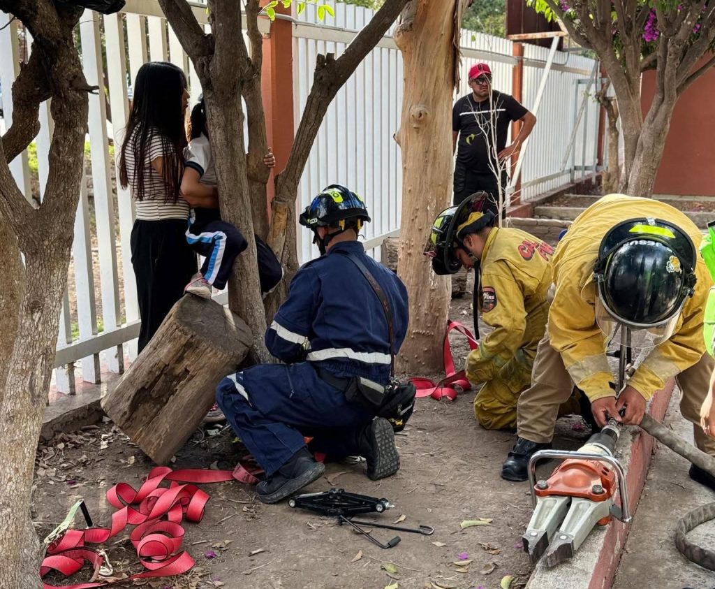 Una menor quedó atrapada en un árbol dentro de una institución educativa ubicada en la comunidad de El Sauz Alto, luego de que una de sus extremidades quedara atorada, impidiéndole liberarse por sus propios medios.