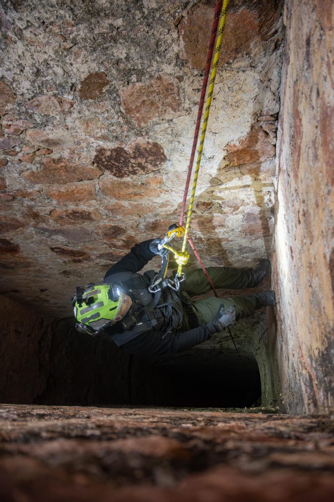 Ante la emergencia, personal especializado del Instituto desplegó maniobras técnicas de rescate vertical, utilizando equipo de seguridad adecuado para realizar el descenso y la posterior extracción del animal, cuidando en todo momento la integridad física del canino y del equipo de rescatistas.