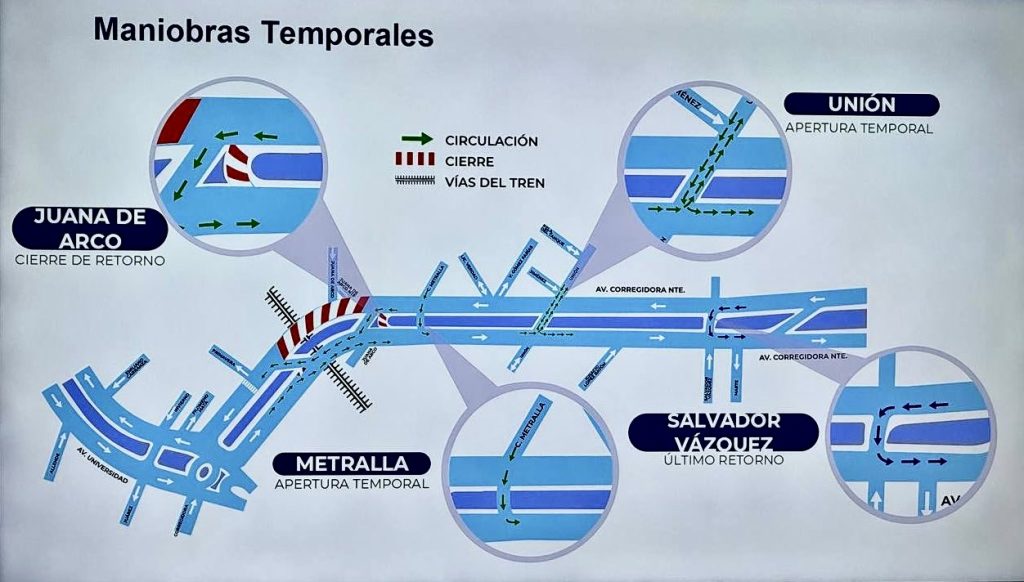Asimismo, se realizarán ajustes en camellones y retornos, y en el caso de Metralla, se abrirá un paso directo hacia el norte, debido a que la mayoría de los vehículos que salen de esta vialidad se dirigen en ese sentido. Algunos retornos cercanos a la obra permanecerán cerrados para evitar conflictos viales.