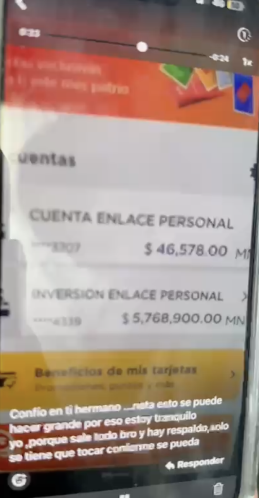 Además, los denunciantes señalan que Edson E. C. C. presumía en videos y chats supuestos ingresos millonarios, incluyendo un video donde muestra más de 6 millones de pesos como “respaldo financiero”. Sin embargo, dicha cuenta no estaría a su nombre, sino a nombre de Enrique J. T. G., quien presuntamente, junto con Edson, administraría grupos de Facebook que por motivos de no intervenir en la investigación se reservan losnombres, donde se publicaban las ofertas de inversión.