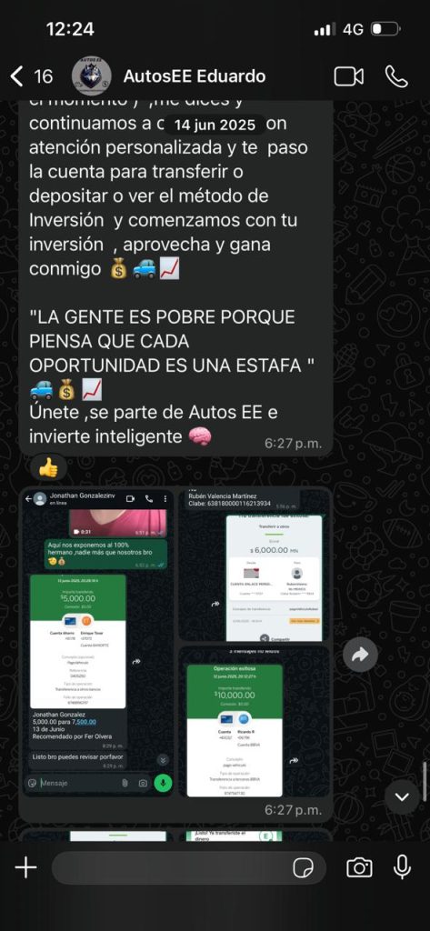 De acuerdo con la denuncia recibida, la inversión inicial se realizaba mediante transferencias bancarias, sin la firma de contratos, sin garantías legales y únicamente bajo acuerdos verbales. La persona señalada como responsable de este presunto esquema es Edson E. C. C., quien se presentaba principalmente a través de WhatsApp, enviando fotografías y videos de supuestos automóviles recién adquiridos y puestos a la venta, con el objetivo de generar confianza entre sus inversionistas.