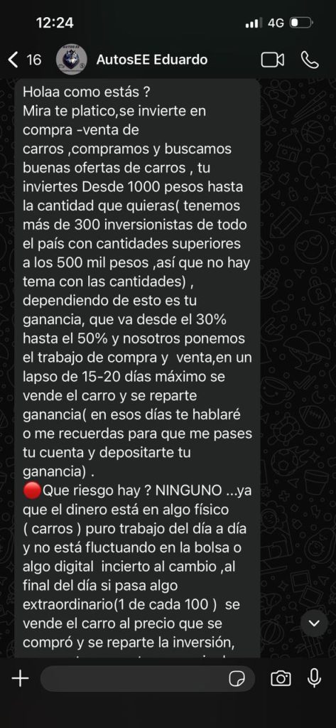 A través de nuestra sección DENUNCIA CIUDADANA, este medio recibió el testimonio de varias personas que aseguran haber sido afectadas por un posible esquema de fraude piramidal que operaba bajo la promesa de invertir en la compra y venta de automóviles, ofreciendo rendimientos de hasta un 50% o más en tan solo 15 días, una cifra que se consideran atípica, riesgosa y altamente sospechosa dentro de cualquier esquema legal de inversión.